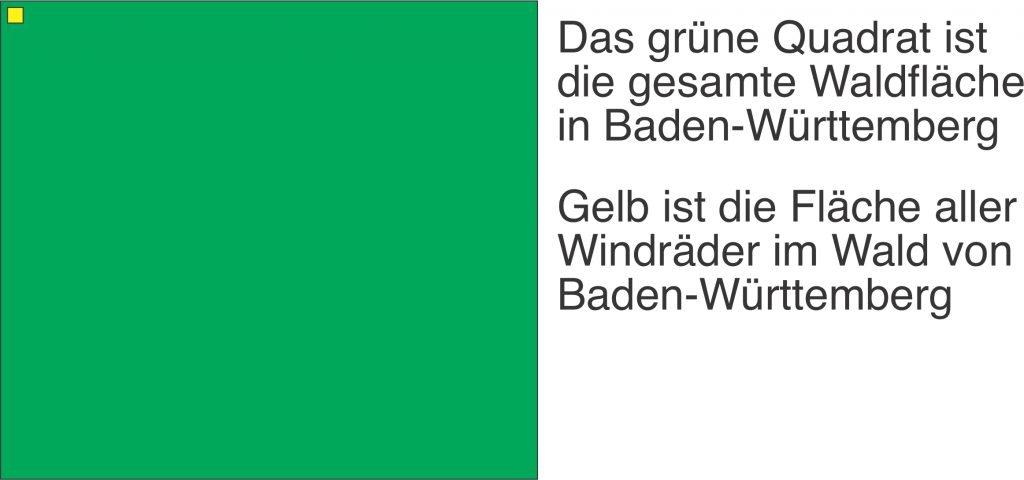 Nachfolgend sehen Sie ein Beispiel aus einem Vortrag. In dem Beispiel wurde an Hand des kleinen gelben Quadrattes dargestellt, wieviel Wald für Windkraftstandorte in Baden-Württemberg im Verhältnis zu der gesamten Waldfläche von Baden-Württemberg tatsächlich gerodet werden.