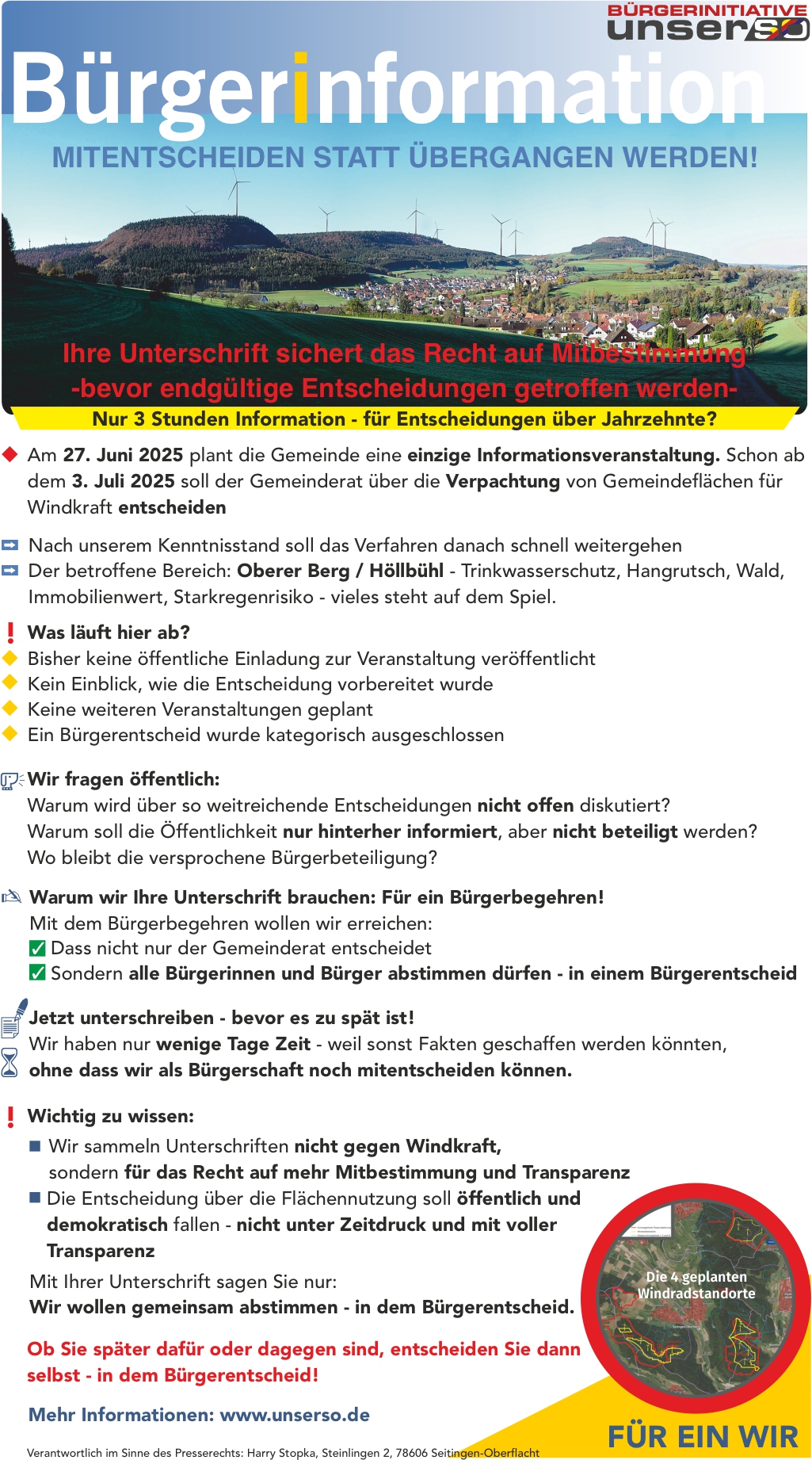 Ein fairer Prozess – echte Information – ein ehrlicher Dialog. Entscheidungen, die unser Dorf, unsere Natur, unser Eigentum und unsere Zukunft betreffen – wie die Verpachtung von Flächen für Windkraftanlagen – sind aus unserer Sicht Mehrheitsentscheidungen. Die Menschen hier tragen die Folgen dieser Entscheidungen. Dann müssen sie auch mitreden dürfen. Bürgerentscheide sind in Baden-Württemberg ausdrücklich vorgesehen – und sie funktionieren. Sie sind kein Zeichen von Misstrauen, sondern von reifer Demokratie.