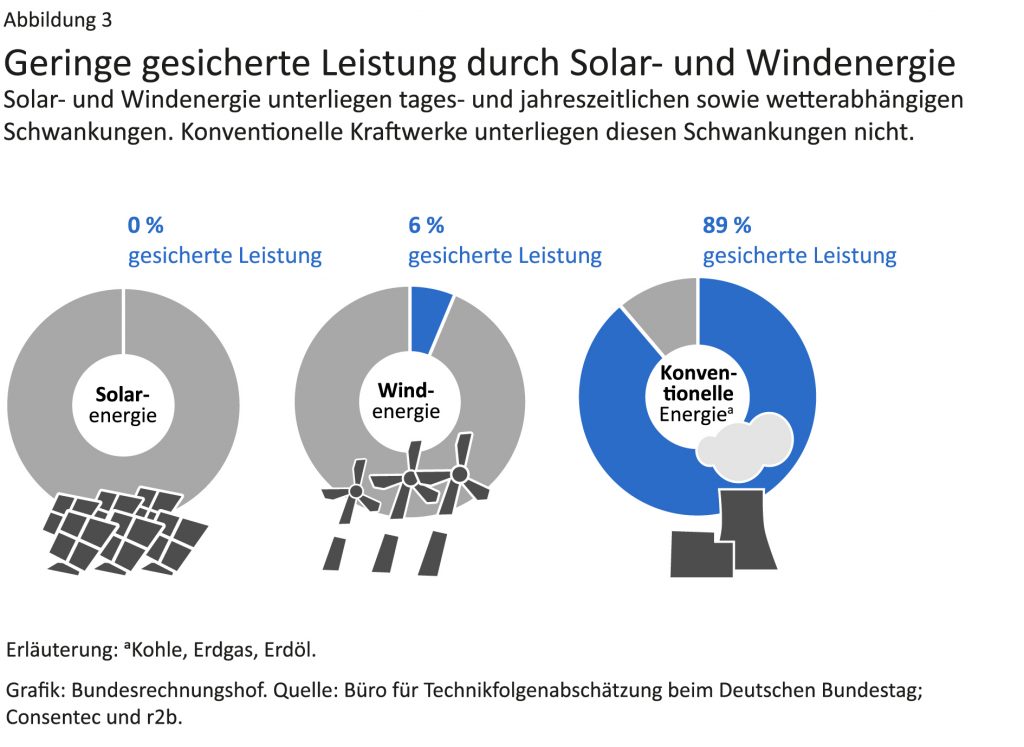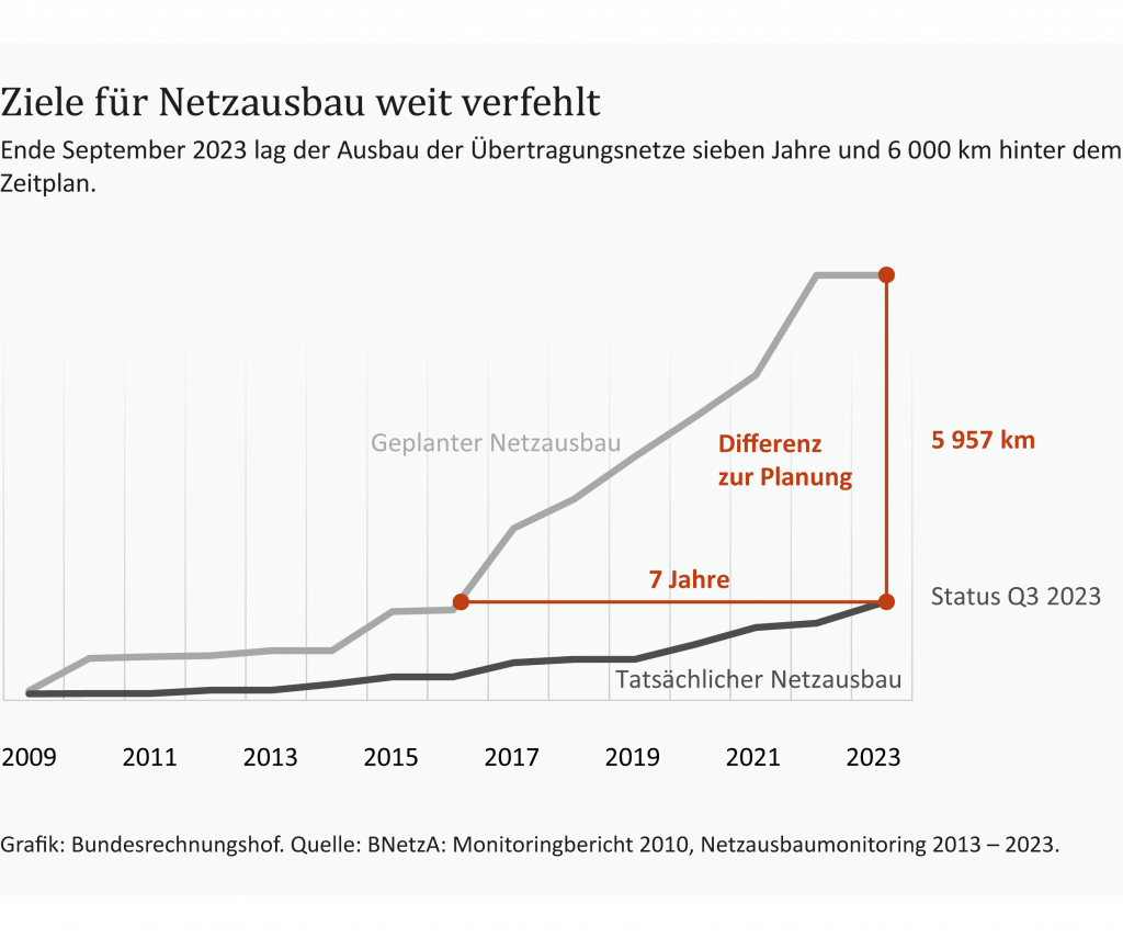 Die Stromerzeugung aus erneuerbaren Energien soll massiv ausgebaut werden. Sie unterliegt jedoch tageszeitlichen, saisonalen und wetterbedingten Schwankungen. Daher muss sie durch Backup-Kraftwerke abgesichert werden. Zudem muss der wachsende Anteil von Strom aus erneuerbaren Energien zu den Verbrauchern transportiert werden. Hier muss der Bund verlässliche Rahmenbedingungen schaffen, damit die beteiligten Akteure die hierfür notwendigen Investitionen tätigen. Doch er hinkt seinen Zielen hinterher: Insbesondere die Ziele für den Ausbau der Windenergie an Land werden absehbar nicht erreicht. Im Jahr 2023 konnte die Bundesnetzagentur nur für die Hälfte der gesetzlich festgelegten Menge Zuschläge erteilen. Den Zeitplan für den Zubau von Backup-Kraftwerken wird das BMWK voraussichtlich nicht einhalten können. Der zwingend notwendige Netzausbau hinkt dem Zeitplan um sieben Jahre und 6 000 Kilometer hinterher.