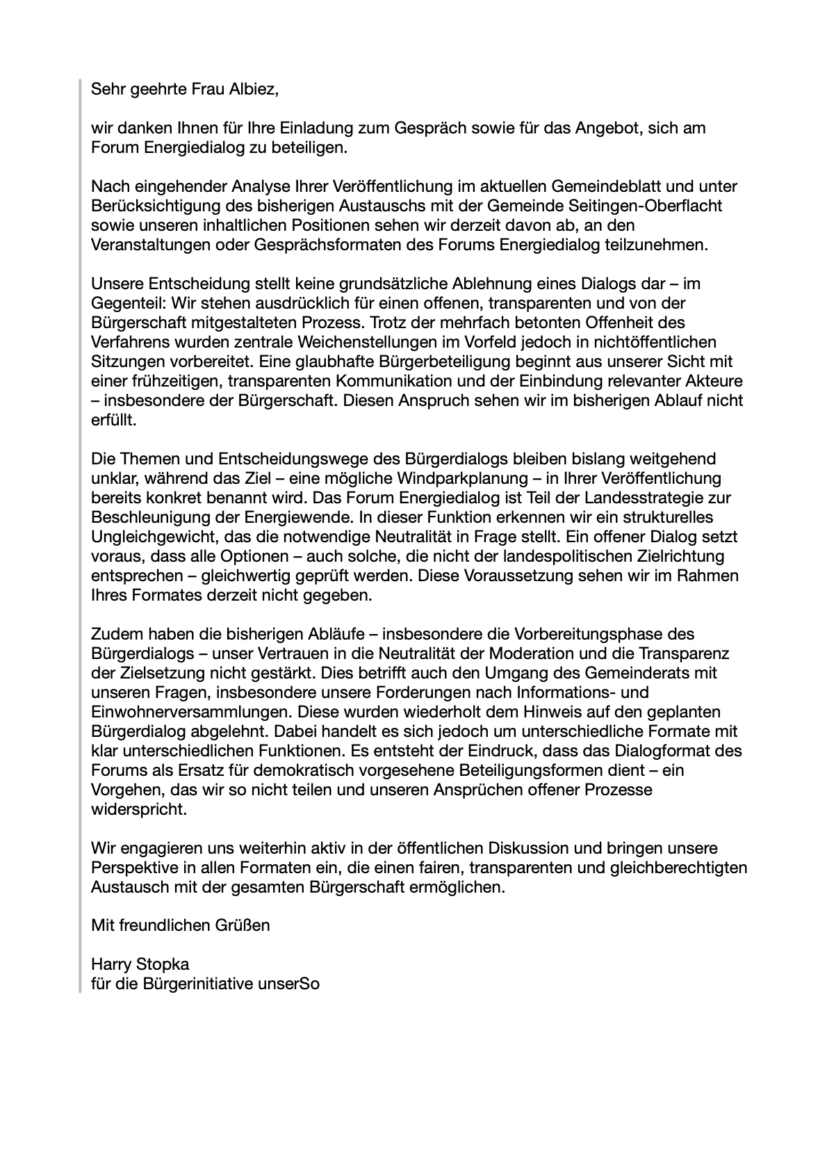 Warum lehnt die Bürgerinitiative unserSo die Einladung zur Teilnahme an dem angekündigt Energiedialog ab? Unsere Gründe.