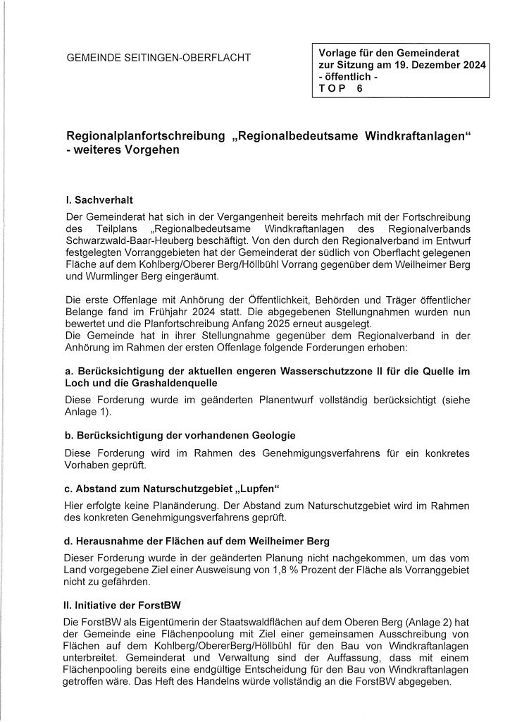 Bürger: Die Frage des Bürgers bezog sich auf TOP 6c der Sitzungsvorlage „Abstand zum Naturschutzgebiet Lupfen“ und der ausgewiesenen Fläche für Windräder. Konkret wollte der Bürger wissen, ob die Gemeinde auf dem Rötenberg in der ausgewiesenen Vorrangfläche für Windenergie größere, zusammenhängende Flächen besitzt.