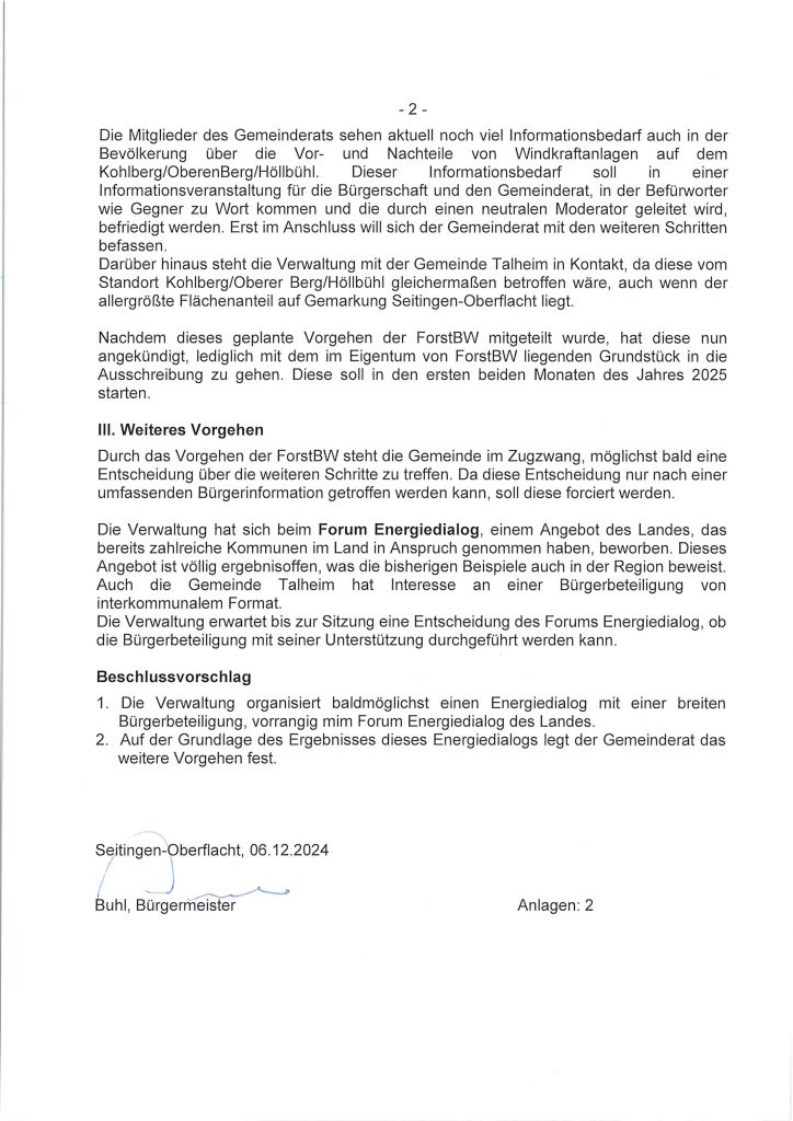 Gemeindeblatt: Der Mitbürger forderte den Bürgermeister auf, sich im Regionalverband Schwarzwald-Baar-Heuberg gegen Windkraftanlagen auf Gemarkung Seitingen-Oberflacht auszusprechen. Der Mitbürger wurde aufgeklärt, dass hier grundsätzlich der Gemeinderat entscheidet. Aktuell beginne die zweite Offenlage sowie Bürgerbeteiligung und Anhörung der Träger öffentlicher Belange für den Teilplan Windkraft des Regionalplans. Dies wolle der Gemeinderat zum Anlass nehmen, um eine umfassende Bürgerinformation durchzuführen. Entscheidungen könnten erst später fallen.