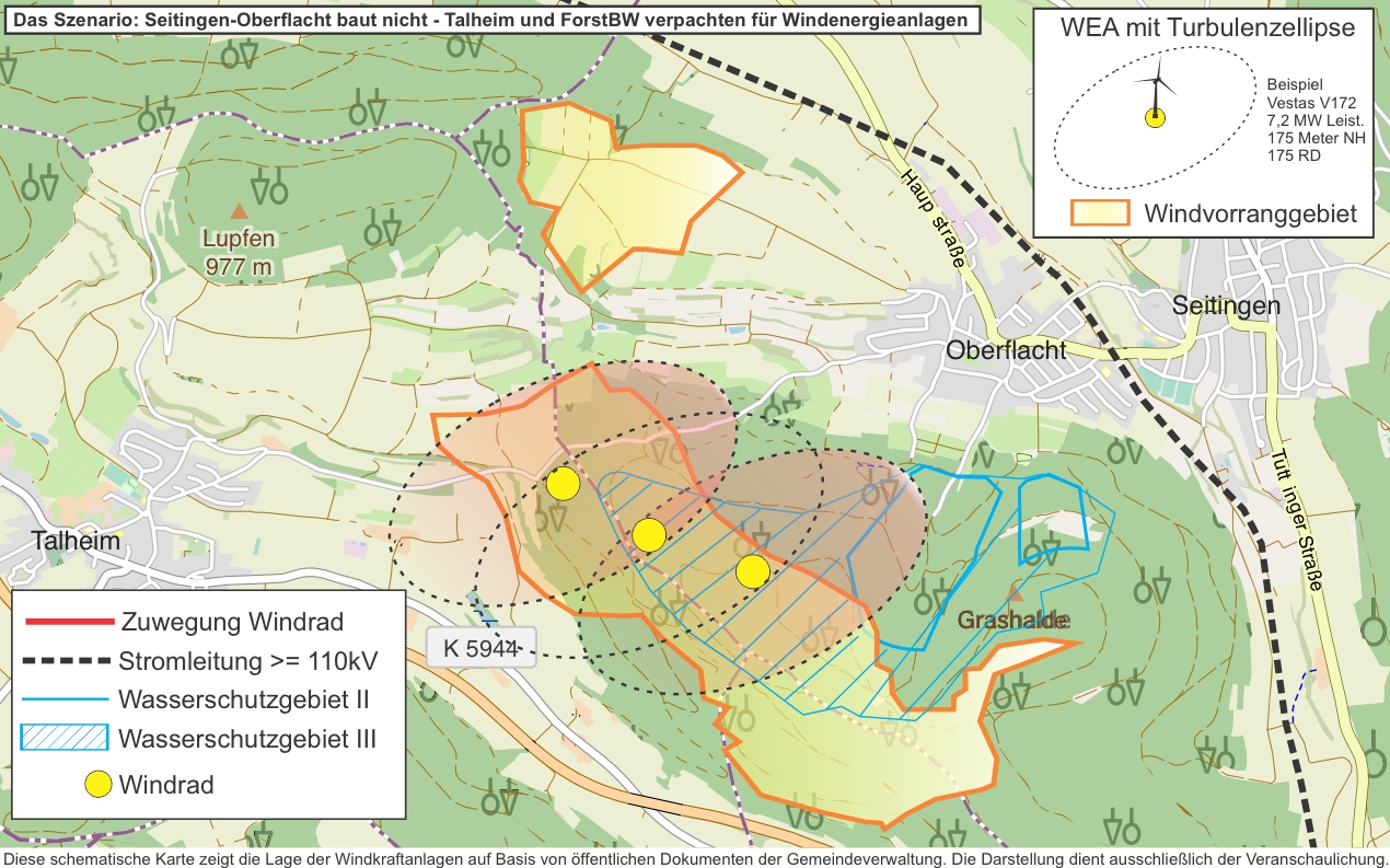 Das in Seitingen-Oberflacht gern propagierte Argument lautet, dass man Windräder auf dem Oberen Berg gar nicht verhindern kann, weil Talheim und oder ForstBW sowieso bauen. Was nicht erwähnt wird, dass eine Behauptung noch längst keine Tatsache darstellt. Tatsachen, in Form von Fakten werden zu dieser Aussage nicht geliefert. Ob ein Wunsch auch Realität wird oder dieser begraben wird, hängt immer von der Machbarkeit ab. Die zu prüfen nennt man Verantwortung. Erst bestellen und sich nach der Lieferung mit den Testberichten beschäftigen oder Gedanken darüber zu machen, was das kostet oder gar, wie man das bezahlen will, nennt man Fahrlässigkeit. In dem Sinn und weil in Seitingen-Oberflacht auch dazu keine Fakten beigesteuert werden, aber dafür viele Behauptungen ohne Nachweis : Beschäftigen wir uns mit einem weiteren relevanten Faktor an Hand dieser Standorte- die Turbulenzellipse, die die Wirtschaftlichkeit und auch die Genehmigungsfähig eines Windrades beeinflußt – rechnet sich dieser Standort in dieser Form überhaupt und wie realistisch ist es, dass dort dann auch wirklich gebaut wird? – klären wir hier.